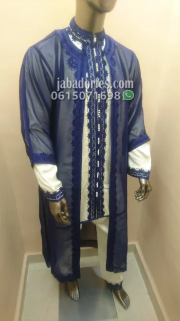 جلابة شعرى مشرطة زرق ملكي قماش جلابة شعرى شفاف و قماش نص ركابية و سروال قندريسي قطن خياطة باليد