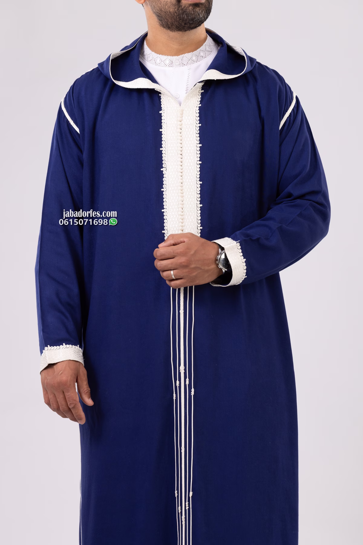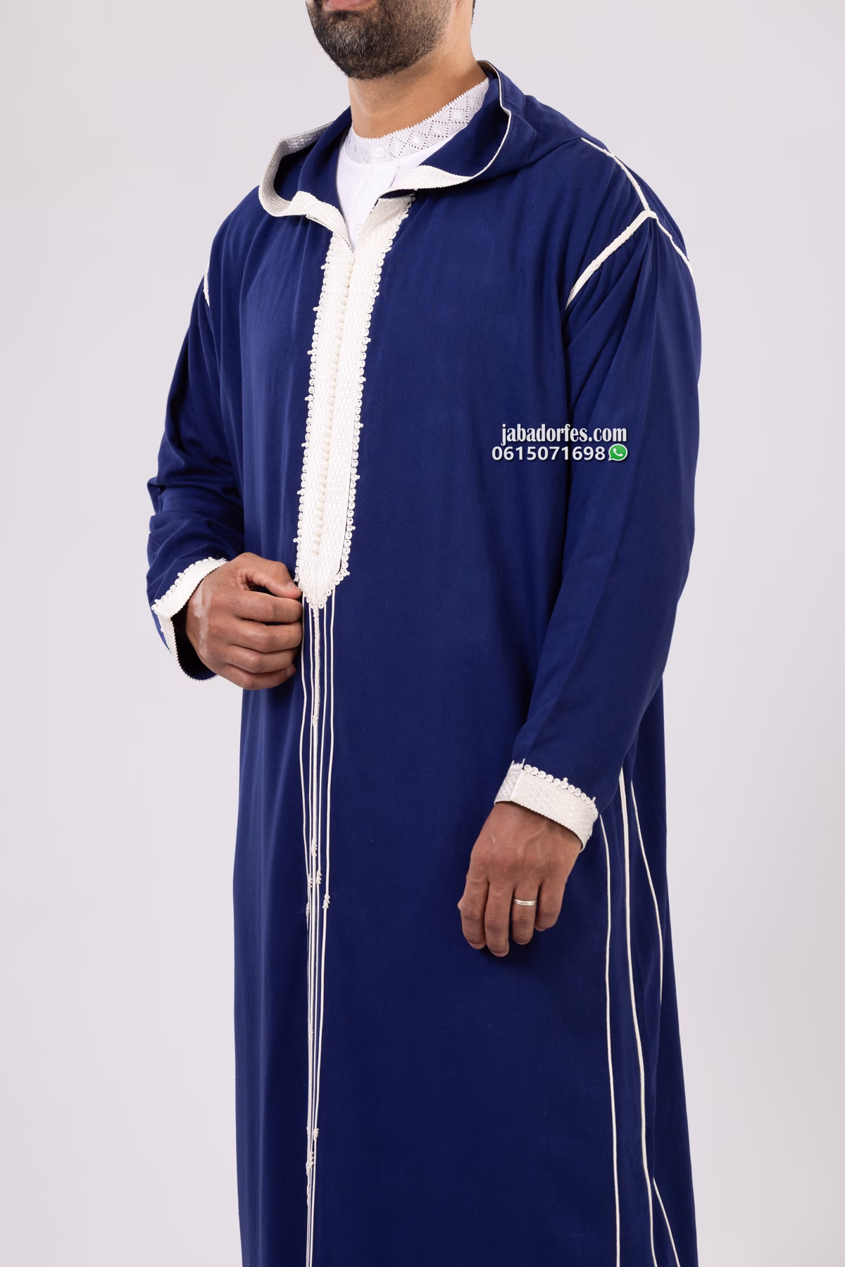 جلابة للرجال مليفة رقيقة بلومارين قماش مليفة رقيقة و خياطة مكينة خماسي زواق برشمان باليد و زواق طرسان مكينة سفيفة و عقاد بلديين باليد.