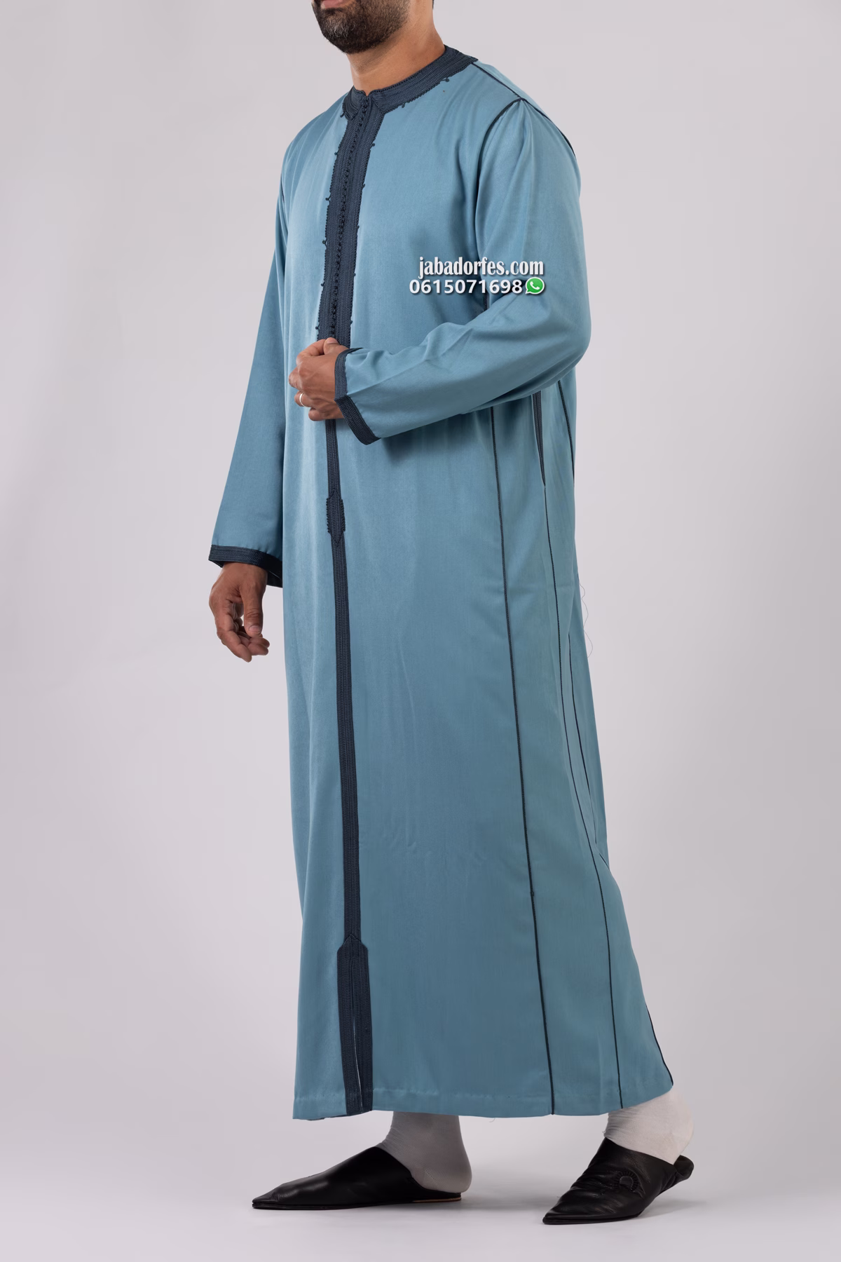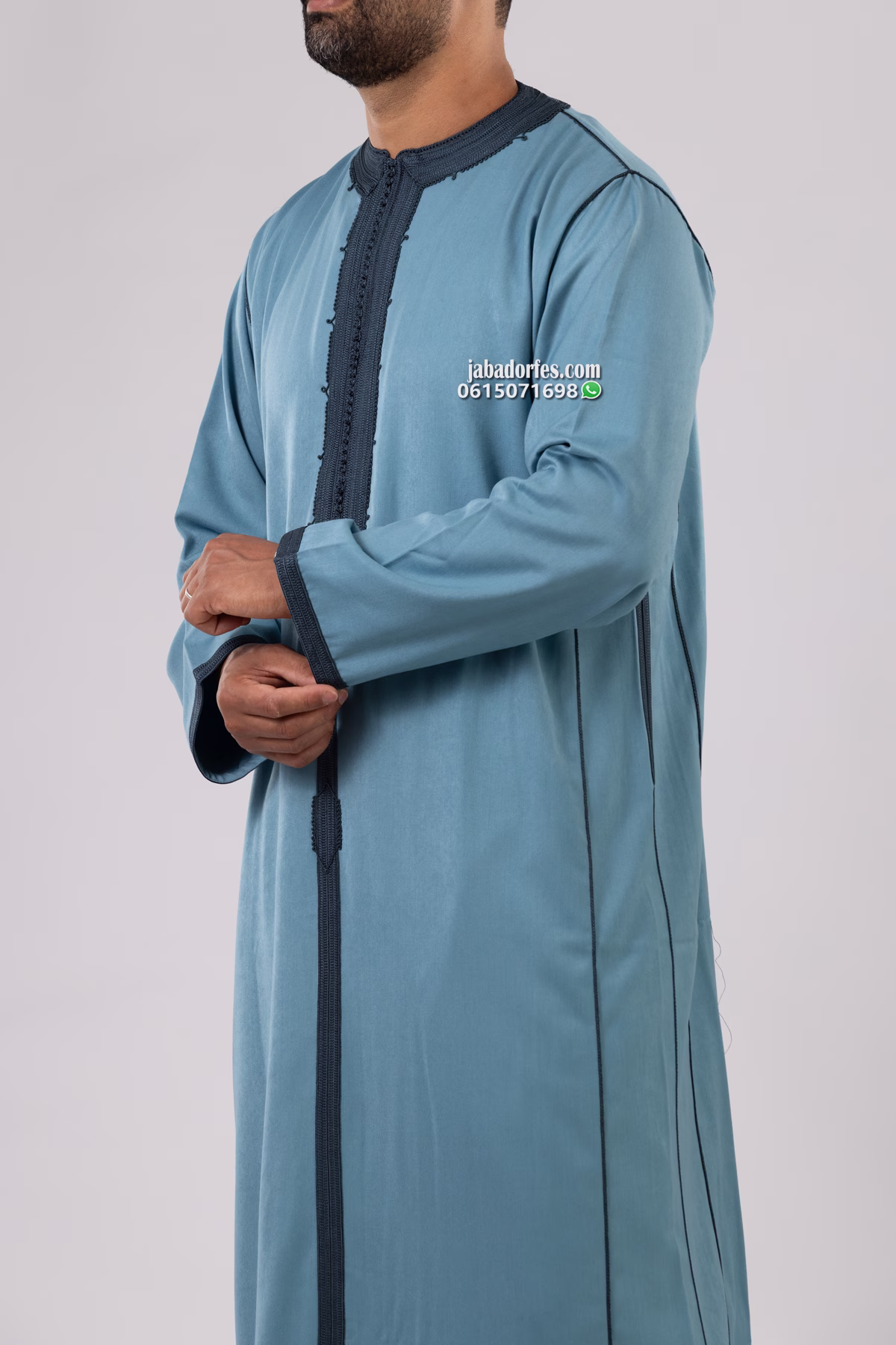 قفطان للرجال مليفة رقيقة أزرق قماش قفطان مليفة رقيقة و الخياطة بالمكينة و زواق طرسان باليد